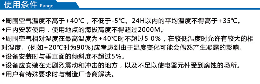 裝置適用于發(fā)電廠、石油、化工、冶金、紡織、高層建筑等低壓配電系統(tǒng)。海拔高度不超過1000m;周圍環(huán)境溫度-25℃ - +40℃;無導(dǎo)電性塵埃、腐蝕性氣體和水蒸氣的場所;無火災(zāi)和爆炸危險(xiǎn)的場所;無經(jīng)常性劇烈震動(dòng)場所。