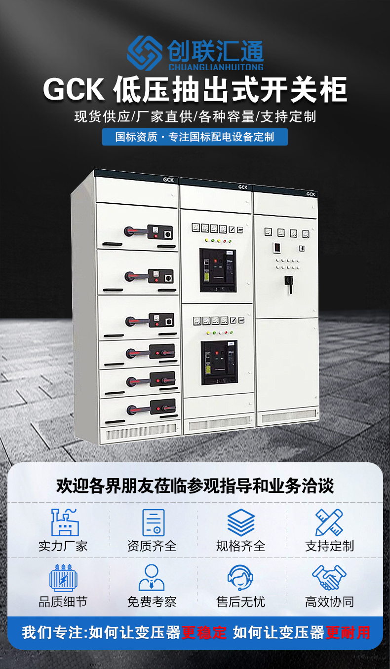 G-GCK型低壓抽出式開關(guān)柜,適用于三相交流50-60HZ,額定工作電壓為380V,額定電流400及以下三相四線制及三相五線制電力系統(tǒng)廣泛應(yīng)用于發(fā)電廠、變電站、工礦企業(yè)、大樓賓館、機(jī)場、碼頭以及廣播電視等通信中心,輸配電、電能轉(zhuǎn)換及電能消耗的動力配電中的PC和電動機(jī)控制中心MCC。